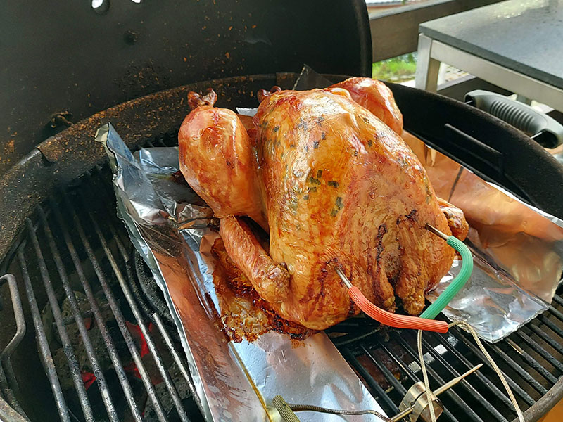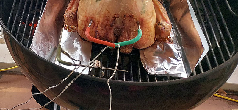 Si vous utilisez un thermomètre connecté vous pouvez installer celui pour la température du grill sur le bord au dessus du lèche-fritte. La température des braises n’est pas importante, on veut la température de la « chaleur tournante » vers la dinde.