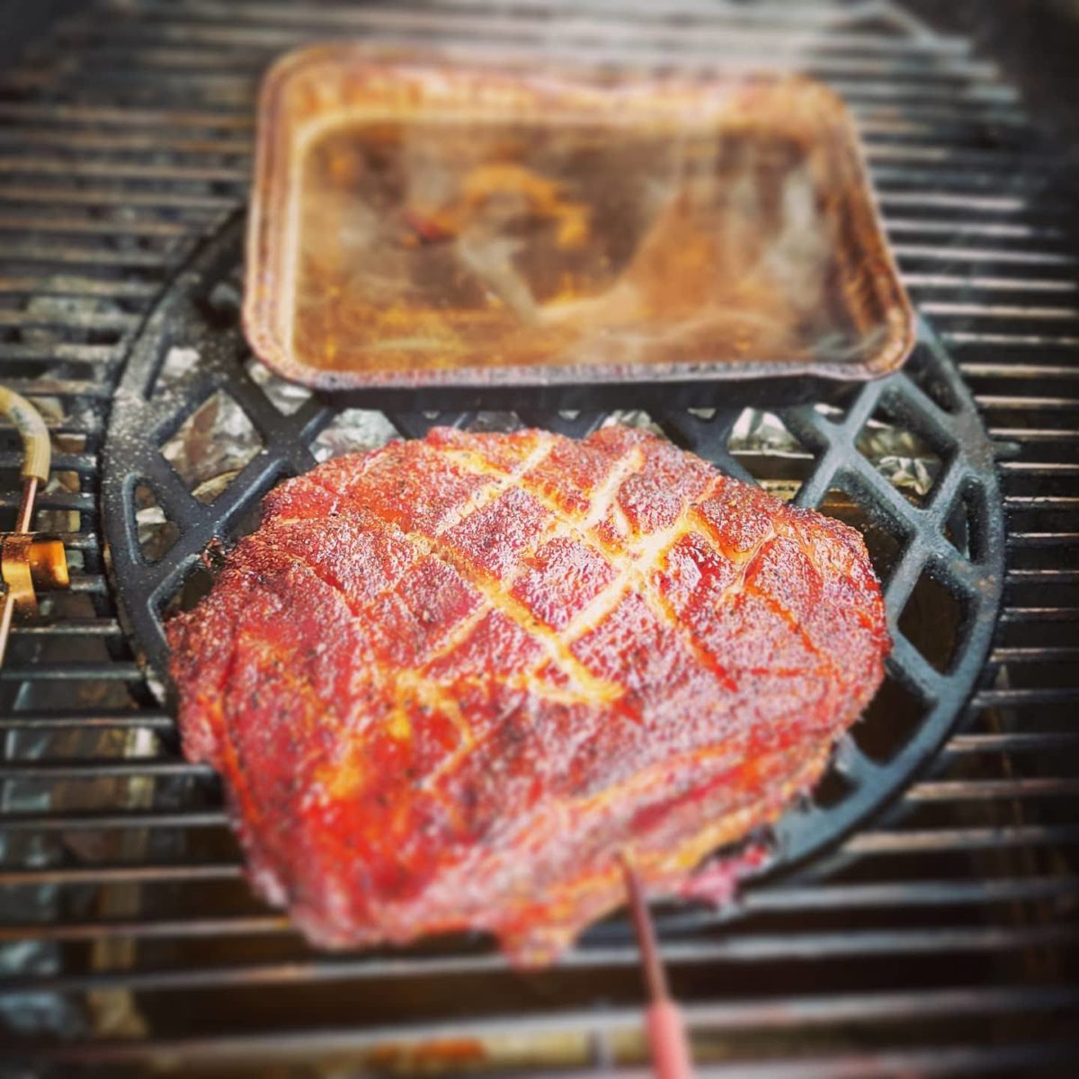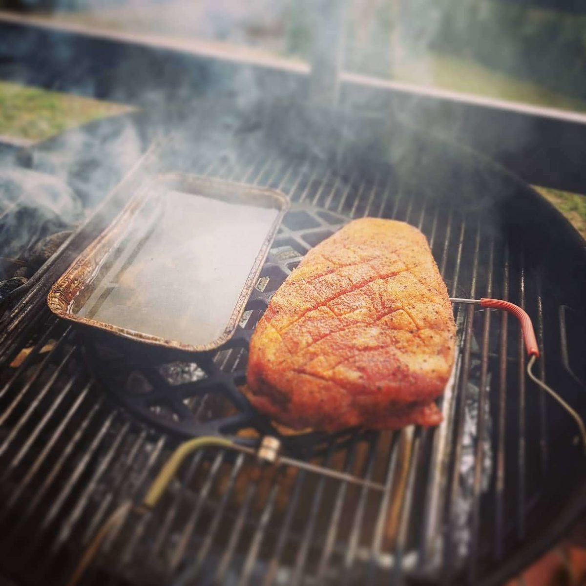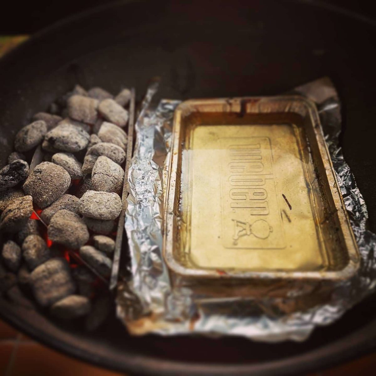 D’un côté, un panier pour les briquettes, ou un autre moyen de les garder sur le côté et un lèche-fritte avec de l’eau en face. On remet la grille et un autre lèche-fritte avec de l’eau au dessus des briquettes. Un smoker doit être humide.