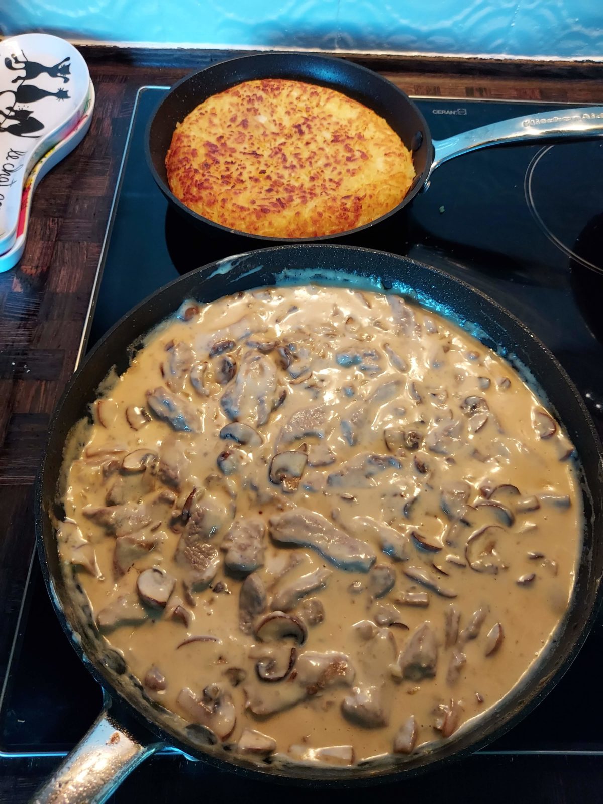 Das Geschnetzelte mit Salz und Pfeffer aus der Mühle würze. Eine grosse Teflonpfanne mit Öl und etwas Butter sehr gut erhitzen, einen Teil des Fleisches beigeben und kurz anbraten. Das Fleisch aus der Pfanne nehmen, warm stellen. Mit dem restlichen Fleisch ebenso verfahren. In derselben Pfanne die Butter erhitzen, die Zwiebeln beigeben und dünsten. Die in Scheiben geschnittenen Champignons dazugeben, mit dem Mehl stäuben, vermischen und etwas kochen lassen. Weisswein beigeben und zur Hälfte einreduzieren. Den Bratensaft vom Fleisch und den Rahm dazugeben und alles zur gewünschten Konsistenz einkochen. Mit Salz und Pfeffer abschmecken. Das Fleisch in die Sauce geben (nicht mehr kochen) und mischen. (Parce qu’en Suisse, on est Polyglotte..)